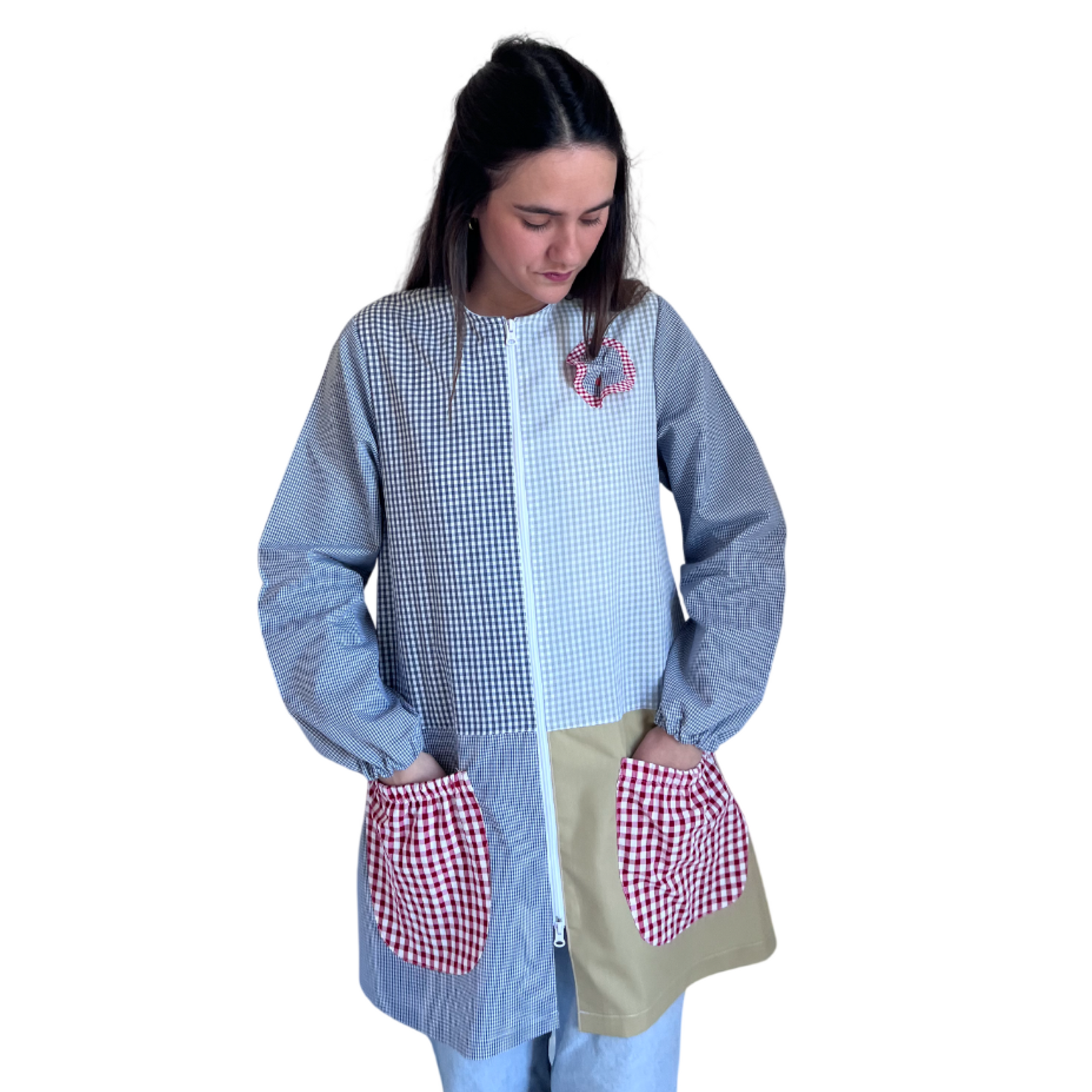 Bata de manga larga campana con dos bolsillos interiores y cremallera de doble carro.